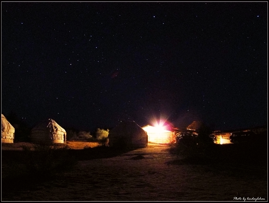 這個行程相信是到烏茲別克必遊的項目,Yurt Camp描述得相當吸引,有厠所,浴室,有電等,我們以為是沙漠中一個蒙古包酒店,又或是在沙漠中的一個蒙古包村落。但我們到步之後....,有點不倫不類的感覺,沒有荒涼感,沒有大漠的感覺,看不見被沙漠包圍,隨了行起來滿腳沙之外,眼見只得11個蒙古包排列整齊的聚在一起,範圍不算大,另外有一間石屋,是管理處;一個大帳篷是餐廳,公共廁所及浴室都算乾淨,但沒有沖身熱水,營內隨了我們沒有別的遊客。