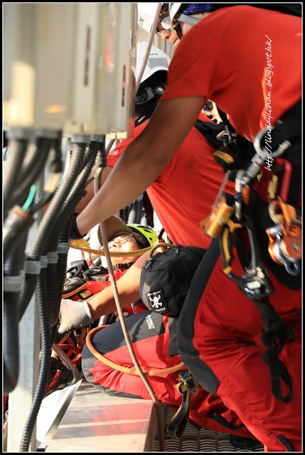 世運壓扁的貓道,這項目限時70分鐘內完成,隊伍要在狹窄的貓道把躺在擔架的傷者從高空運送到地下。身型較大的參賽者,在貓道內轉身都有困難,如何把硬蹦蹦的擔架床移出貓道外?對我們來說真的是巨大的考驗。