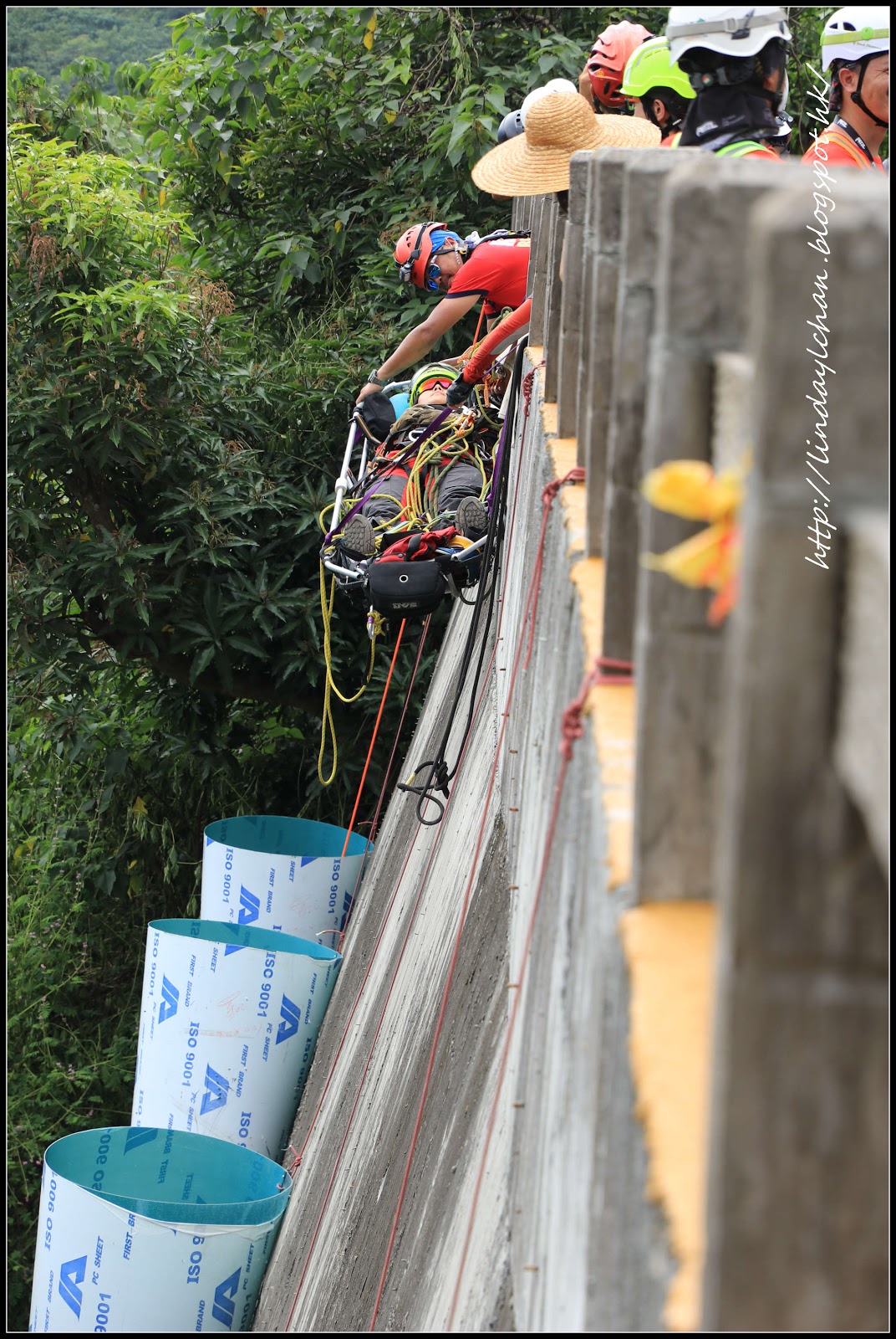 這個關卡真的很不簡單,其中一支隊伍在這關卡呈現「丈二和尚摸不著頭腦」的情況,我們離開時,他們還沒頭緒的拉著擔架床,不上不落。我們下山後,回看山上,他們的擔架床仍然懸吊在橋上。原來他們發生了失誤,甚至一位隊員在比賽中受傷,要入醫院治療。但這隊堅毅的隊伍,抱著永不放棄的精神,在缺少一位成員的情況下繼續作賽。最終完成了這個項目,在場的義工們及其他隊伍都為他們鼓掌。